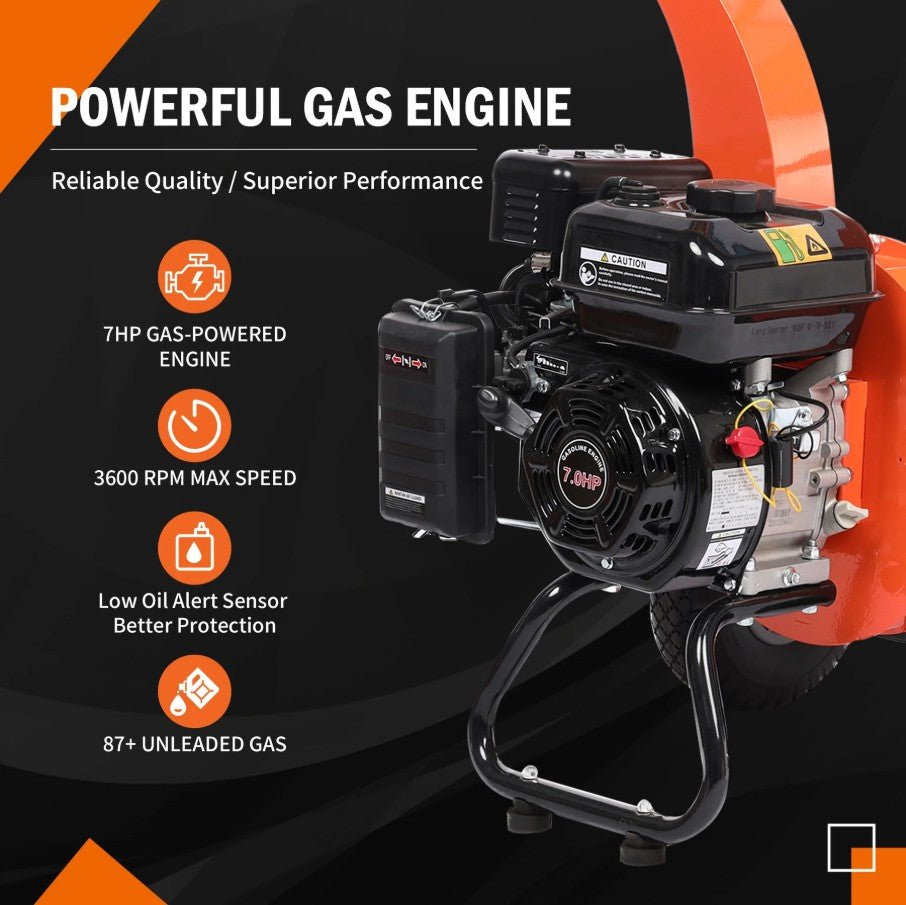 The EFCUT C30 LITE wood chipper is powered by a 7HP 212cc 4-stroke OHV gas engine, delivering up to 3600 RPM for efficient chipping. It handles branches up to 3″ thick with a 15:1 reduction ratio, converting yard waste into fine mulch. Its 11.8″ cutting rotor and high-speed steel blades ensure stable, high-volume performance. Features include a wide feeding hopper, vertical discharge chute (90°–145°), and dual check windows for easy blade access and debris clearing. Lightweight yet durable, it’s ideal for forestry, landscaping, and garden cleanup.
