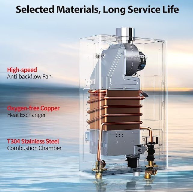 The Mizudo indoor tankless water heater is a compact, efficient solution for small homes, apartments, and cabins, delivering 3.6 GPM of continuous hot water with 80,000 BTU. Its sleek design includes a touch panel LED display, supports simultaneous water supply for 2 to 3 water points, and precise temperature control. The heater features an oxygen-free copper heat exchanger for durability, and a high-speed anti-backflow fan. With over 50% space savings compared to traditional heaters. Specifications include 120V power, and wall-mounted installation.