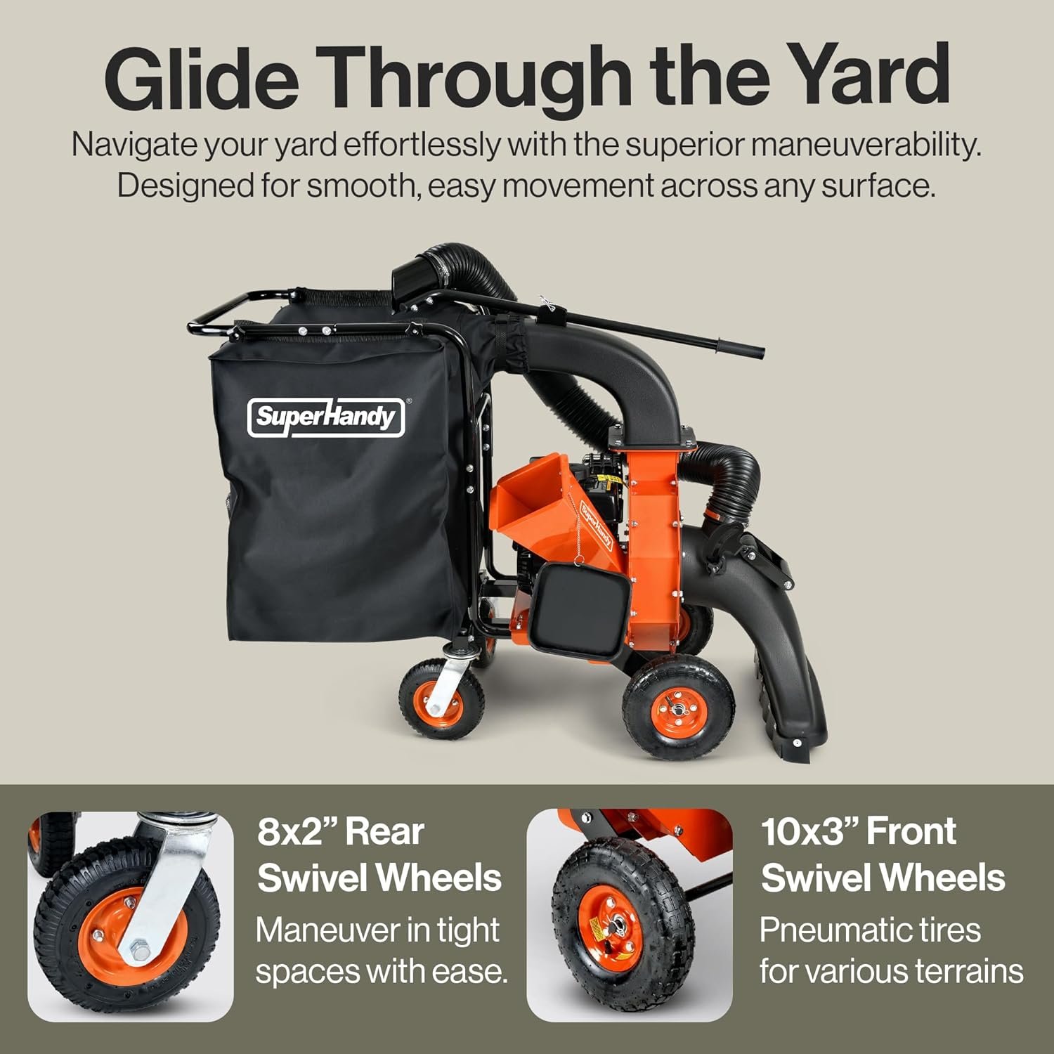 The SuperHandy GUO128 has the dual operation of a leaf vacuum and woodchipper that can chip branches up to 2 in. in diameter. Additional features include a large collection bag and 10 x 3 in. front pneumatic wheels and 8 x 2 in. rear swivel wheels.